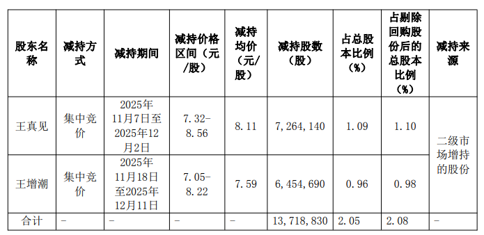 顺博合金2025年12月13日发布关于部分控股股东及一致行动人暨董事减持股份计划实施完成的公告。截至公告披露日,王真见、王增潮以集中竞价交易方式合计减持公司股份13,718,830股(占公司总股本的2.05%,占剔除公司回购专用证券账户股份后总股本的2.08%)。本次减持计划已经实施完成。