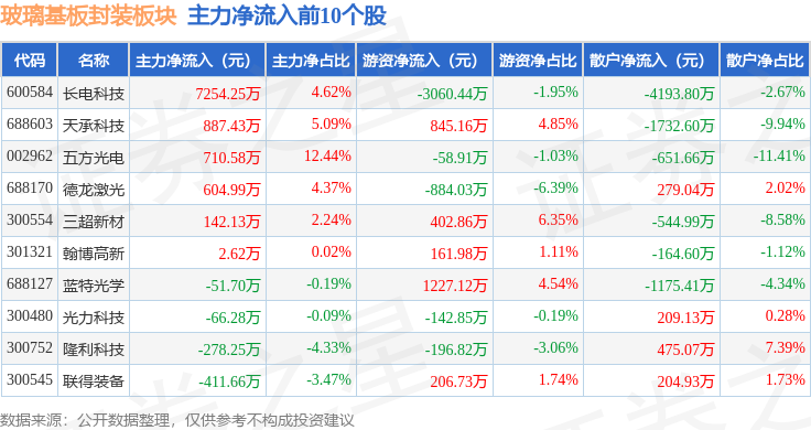 从资金流向上来看,当日玻璃基板封装板块主力资金净流出4.94亿元,游资资金净流入9997.04万元,散户资金净流入3.94亿元。玻璃基板封装板块个股资金流向见下表:
